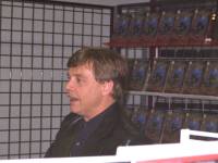 Finally, the back doors flew open and in marched the apple of Anakins eye. Decked out in leather and black denim, Mr. Hamill actually looked quite handsome (Ive always thought he looked a bit extreme in photographs, but in natural (?) light he looked wonderful. He needs to have a chat with whoever is doing his lighting.) He was extremely aimiable and even snuck in a few quick autographs on paraphenalia that other fans had dared to bring in (even though the comic store staff had said that that was a big no-no). When I finally had my turn I was struck by just how tiny he is (no wonder the landspeeder prop appeared so miniscule in Yerba Buena, it was built to scale!) But he was exceedingly nice and managed to carry on some semblence of a conversation with me even though Im sure whatever I was babbling was completely incoherent. We posed for a picture, and