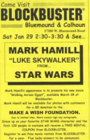 Walking Across EgyptPremiere in Milwaukee (Wisconsin)My son and I met Mark at the public "meet and greet" that he did in Milwaukee at the Blockbuster Video store in Brookfield WI. (My nine year old son) Aaron was extremely excited to meet his idol Mark Hamill, and it was quite a day for him. We waited for 2 hours in 28 degree weather, but Aaron didn't care. Mark was at the end of the wait so it was OK.